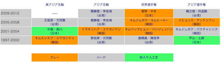さらに前のクール(2001ー2004)ではキムボブヒョン・バンジュンハン(韓国)、キムジェボク・パクチャンソク(韓国)、イウオンハク・ユウヨンドン(韓国)、中堀・高川(日本)、と今度は台湾選手がいなくなる。