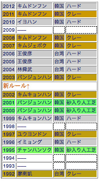 過去17度あった四大国際大会での個人戦シングルス、そのうち13回韓国が優勝と圧倒(後の4回は台湾)。しかし新ルール下ではやはりハードコートの攻略に苦労している。2004からの3連敗は(決勝にあがったのも2005だけ)それまで8連覇しているだけに屈辱的だったはず。