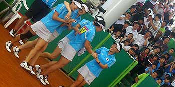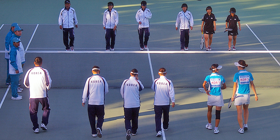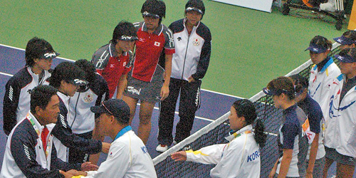 2006ドーハ大会女子団体決勝終了直後。韓国が大逆転で大会4連覇を決めた。韓国は翌年の最強チームとほぼ同じだが、この時点ではいかにも若いチーム。エースキムチウンの故障もあり、個人戦シングルス、ダブルスでは決勝にすら進めていない。