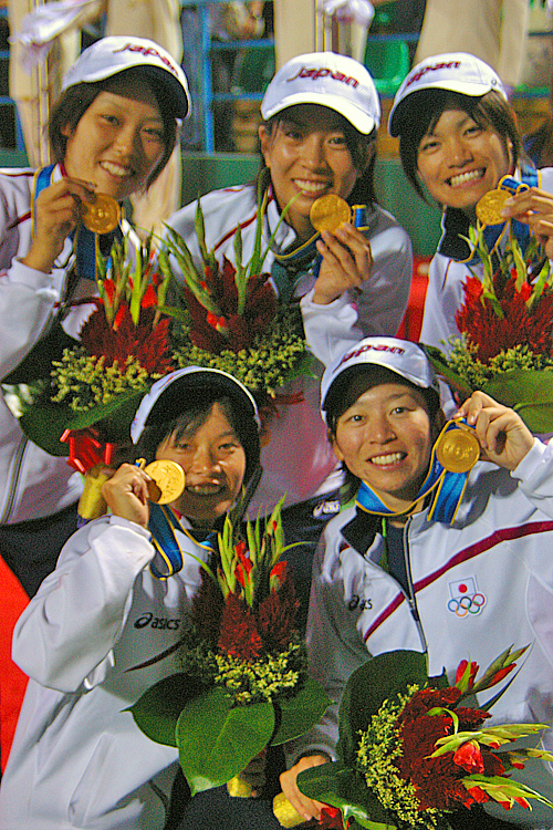 2010年第16回アジア競技大会で念願の団体初優勝を果たした日本女子(1990年に北京大会で優勝しているが当時は公開競技(デモンストレーション)だった)。
