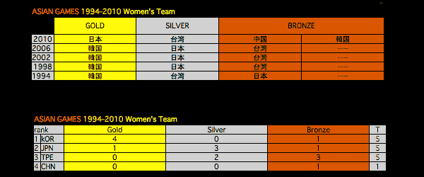 アジア競技大会とその翌年に開催される世界選手権での、この種目つまり『女子団体戦』における韓国の強さは異様といえ、1994年以来現在迄にいわゆる四大国際大会が19回開催され韓国女子は11回優勝しているが内8回がこの2大会での勝利になる。