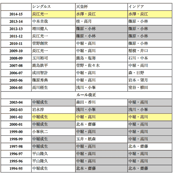 2月1日に大阪で開催された全日本インドアで水澤悠太・長江光一(NTT西日本広島)が初優勝を果たしたことで、今年度(2014.04〜2015.03)、天皇杯(10月大館)での優勝とあわせて日連主催の全日本タイトル二つをこのペアが独占したことになる。