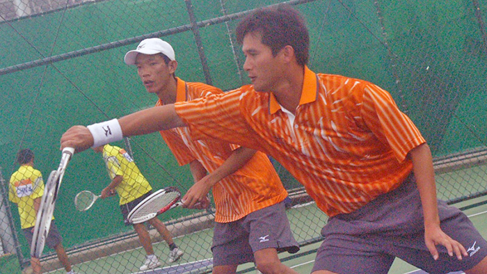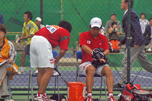 王俊彦・方同賢(台湾)。菅野・篠原戦にて。出足、強力なベースラインからの攻撃に0−2のリードを許すが、以降フレキシブルにテニスを変化させて逆転。いろんな意味でターニングポイントとなった重要な一戦。
